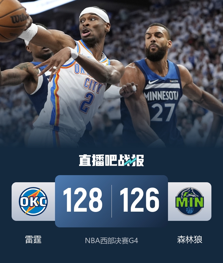 5月27日讯 NBA季后赛西部决赛G4,森林狼继续坐镇主场迎战雷霆。目前大比分雷霆2-1领先。