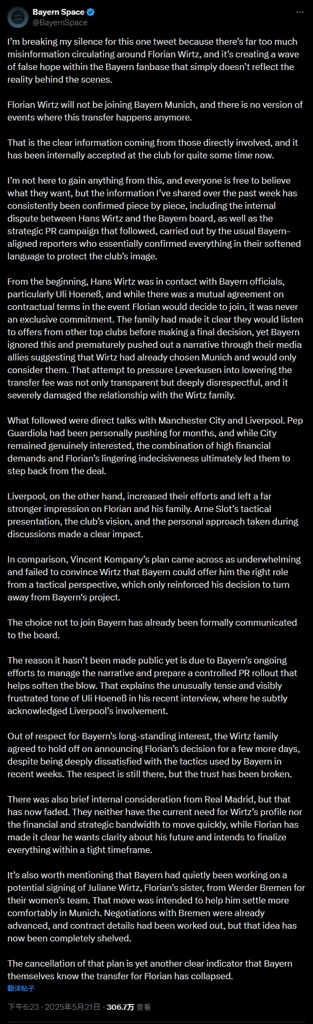 5月21日在众多德媒还在报道维尔茨与拜仁之间的传闻时,该博主就已经站出来辟谣称:围绕着维尔茨转会有着太多错误的信息,维尔茨不会加盟拜仁...不加盟拜仁的决定已正式告知董事会,之所以未公开,是因为拜仁正竭力控制舆论,准备用一套温和的公关说辞来缓冲打击,这也解释了赫内斯近期采访中反常的焦躁语气,他隐晦承认了利物浦的介入。