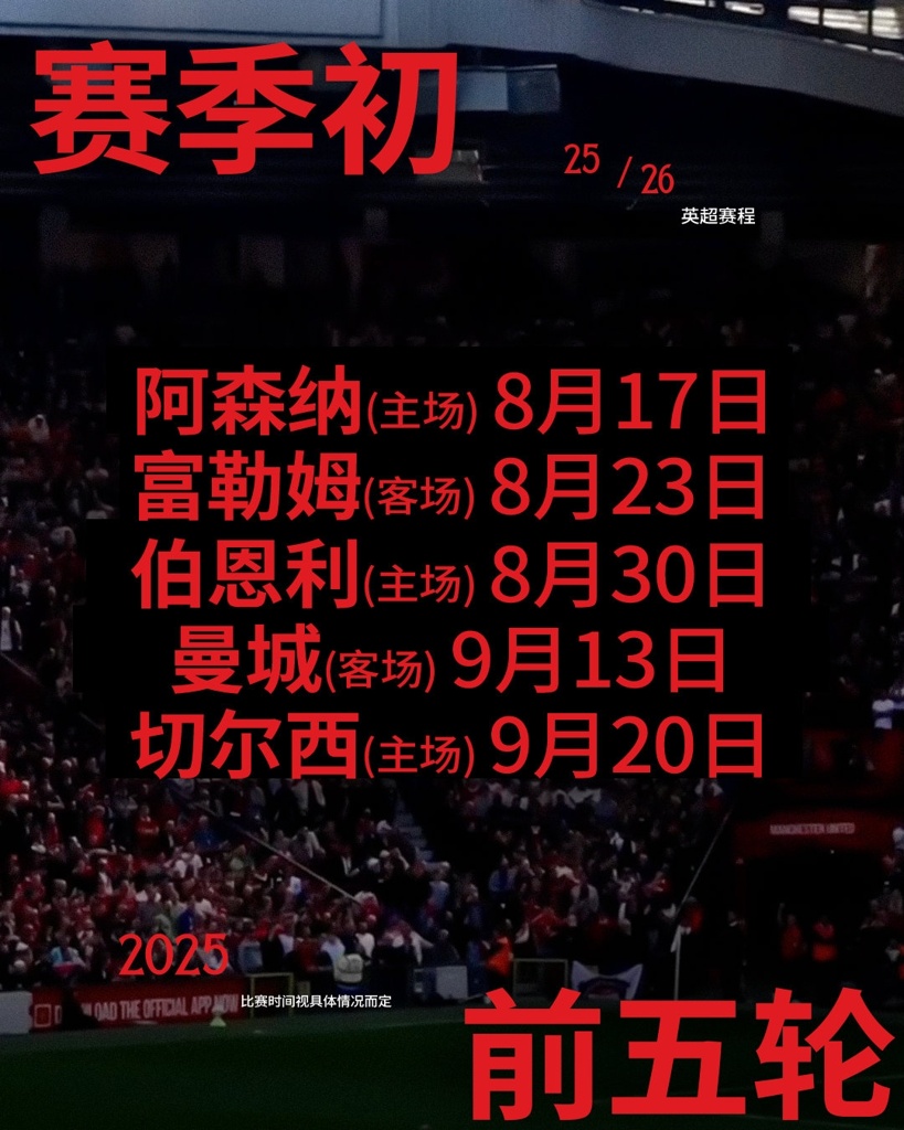 06月18日讯 英超官方公布25/26赛季赛程,曼联队将在首轮对阵阿森纳。值得一提的是,曼联前5轮英超赛程将包含上赛季的英超2/3/4名:阿森纳、曼城和切尔西,开局十分艰难。