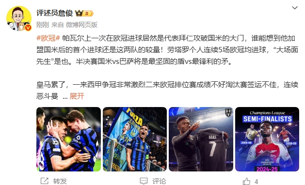 04月17日讯 帕瓦尔上一次在欧冠进球居然是代表拜仁攻破国米的大门,谁能想到他加盟国米后的首个进球还是这两队的较量!劳塔罗个人连续5场欧冠均进球,“大场面先生”是也。半决赛国米vs巴萨将是最坚固的盾vs最锋利的矛。