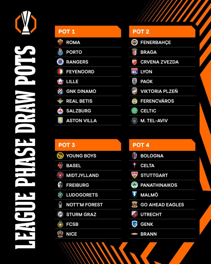 08月29日讯 25-26赛季欧联抽签结果出炉,罗马碰斯图加特,维拉战萨尔茨堡,森林遇波尔图。